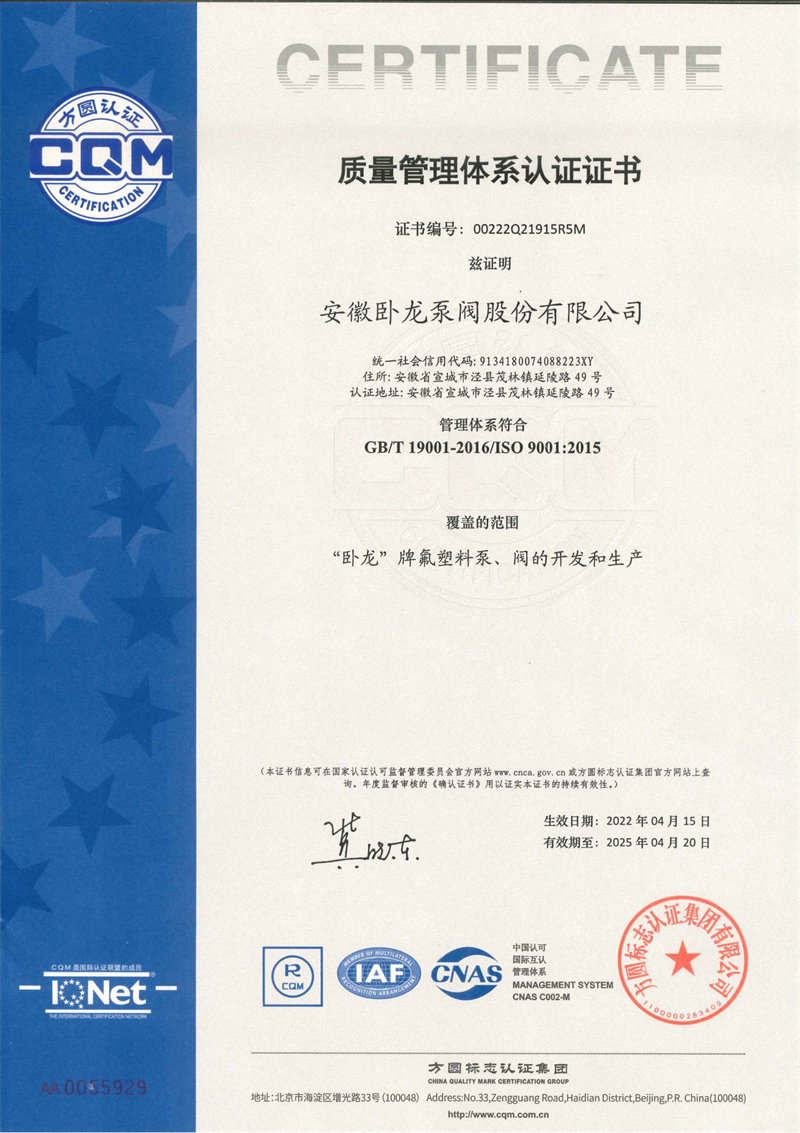安徽臥龍泵閥股份有限公司位于風(fēng)景秀麗的江南古鎮(zhèn)——安徽省涇縣茂林鎮(zhèn)。公司前身涇縣氟塑料制品廠創(chuàng)建于1985年,是國內(nèi)較早引進(jìn)中科院上海有機(jī)化學(xué)研究所專利材料——"氟塑料合金",并以此耐腐蝕材料專業(yè)生產(chǎn)制造化工泵、閥、襯氟管道等產(chǎn)品的企業(yè)。公司經(jīng)過歷次的改制變革,2015年更名為安徽臥龍泵閥股份有限公司。